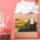 A side profile of a majestic red dragon perched on the edge of a rugged cliff, it is silhouetted against a sunset sky. Behind the dragon is a castle. The warm hues of the setting sun bathe the scene in rich oranges, yellows and reds.