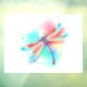 Red, flying, artistically drawn, in bright colours with textured iridescent, blue wings on white background, painted over with splashes of watercolor paint. Bright red dragonfly.