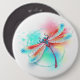 Red, flying, artistically drawn, in bright colours with textured iridescent, blue wings on white background, painted over with splashes of watercolor paint. Bright red dragonfly.