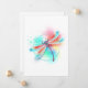 Red, flying, artistically drawn, in bright colours with textured iridescent, blue wings on white background, painted over with splashes of watercolor paint. Bright red dragonfly.