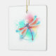 Red, flying, artistically drawn, in bright colours with textured iridescent, blue wings on white background, painted over with splashes of watercolor paint. Bright red dragonfly.