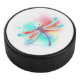 Red, flying, artistically drawn, in bright colours with textured iridescent, blue wings on white background, painted over with splashes of watercolor paint. Bright red dragonfly.