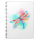 Red, flying, artistically drawn, in bright colours with textured iridescent, blue wings on white background, painted over with splashes of watercolor paint. Bright red dragonfly.