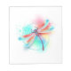 Red, flying, artistically drawn, in bright colours with textured iridescent, blue wings on white background, painted over with splashes of watercolor paint. Bright red dragonfly.
