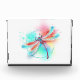 Red, flying, artistically drawn, in bright colours with textured iridescent, blue wings on white background, painted over with splashes of watercolor paint. Bright red dragonfly.