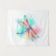 Red, flying, artistically drawn, in bright colours with textured iridescent, blue wings on white background, painted over with splashes of watercolor paint. Bright red dragonfly.