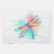 Red, flying, artistically drawn, in bright colours with textured iridescent, blue wings on white background, painted over with splashes of watercolor paint. Bright red dragonfly.