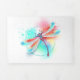 Red, flying, artistically drawn, in bright colours with textured iridescent, blue wings on white background, painted over with splashes of watercolor paint. Bright red dragonfly.