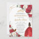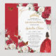 Red Dress White Roses Floral Girl Gold Quinceañera Invitation