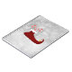 Whimsical Christmas design. A red elf shoe / slipper with an adorable pointy toe and cute golden bell hanging down. 2 red and white striped candy canes nestled inside. The background is a silver bokeh design with circles and twinkling lights giving it a festive feel.