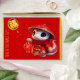 Customisable red greeting money red envelope with cute baby snake wearing Chinese cloths in cartoon style (model n°1) + Fu ideogram for Luck. Golden textured paper (image printed) inside.