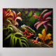 Red eyed dart frog illustrated in the branches of trees surrounded by vibrant tropical flowers in a tropical rain forest.