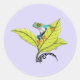 A cute Red Eyed Tree Frog sits upon three leaves against a backdrop of light purple
