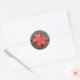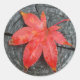 A photograph of a red vibrant maple leaf sits in the centre of dark grey tree rings. This round envelope seal is perfect for autumn thank you notes, birthday cards and invitations.