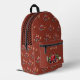 Back to school backpack, in barn red, with farm tractors design. Add the child's name to the front zippered pocket, in tan, printed font, above a single tractor image. The red tractor design includes some fun, farm animals and a dog, and is patterned over the front and sides. Tractor tire marks, in black, go across the zipper section at the top. A cute design for boys or girls.