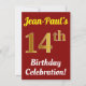 This birthday party invitation design features a message like "Jean-Paul’s 14th Birthday Celebration!", where the name can be customised, and where the number "14th" has a faux gold-like appearance. It also features a red coloured background. The event details on the back can be personalised. It could be used to invite people to somebody’s fourteenth birthday celebration or birthday party. [~Z0000120]