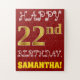 This fun and simple birthday puzzle design features the message "HAPPY 22nd BIRTHDAY", with the "22nd" having a faux/imitation gold-like colour appearance. It also features a customised name, and a red coloured background. It could be a fun and special way to deliver a personalised birthday greeting to somebody who is celebrating their twenty second birthday. [~Z0000200]