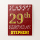 This fun and simple birthday puzzle design features the message "HAPPY 29th BIRTHDAY", with the "29th" having a faux/imitation gold-like colour appearance. It also features a personalised name, and a red coloured background. It could be a fun and special way to deliver a personalised birthday greeting to somebody who is celebrating their twenty ninth birthday. [~Z0000200]