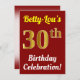 This birthday party invitation design features a message like "Betty-Lou’s 30th Birthday Celebration!", where the name can be customised, and where the number "30th" has a faux gold-like appearance. It also features a red coloured background. The event details on the back can be customised. It could be used to invite people to somebody’s thirtieth birthday celebration or birthday party. [~Z0000120]