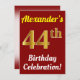 This birthday party invitation design features a message like "Alexander’s 44th Birthday Celebration!", where the name can be customised, and where the number "44th" has a faux gold-like appearance. It also features a red coloured background. The event details on the back can be personalised. It could be used to invite people to somebody’s forty fourth birthday celebration or birthday party. [~Z0000120]