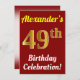 This birthday party invitation design features a message like "Alexander’s 49th Birthday Celebration!", where the name can be personalised, and where the number "49th" has a faux gold-like appearance. It also features a red coloured background. The event details on the back can be customised. It could be used to invite people to somebody’s forty ninth birthday celebration or birthday party. [~Z0000120]