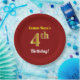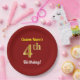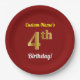 This simple, personalised, birthday-themed paper plate design features a customisable message like "Custom-Name’s 4th Birthday!", where the name can be changed, and with the "4th" having a faux/imitation gold-like appearance. It also features a red coloured background. Paper plates like these could perhaps be used at a party being held to celebrate somebody’s fourth birthday. [~Z0000144]