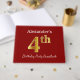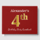 This guest book design features the ordinal number "4th" with a faux gold-like appearance. It also features a customised name, and a red coloured background. It could be used at a party for somebody celebrating their fourth birthday. [~Z0000055]