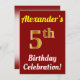 This birthday party invitation design features a message like "Alexander’s 5th Birthday Celebration!", where the name can be customised, and where the number "5th" has a faux gold-like appearance. It also features a red coloured background. The event details on the back can be customised. It could be used to invite people to somebody’s fifth birthday celebration or birthday party. [~Z0000120]