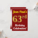 This birthday party invitation design features a message like "Jean-Paul’s 63rd Birthday Celebration!", where the name can be personalised, and where the number "63rd" has a faux gold-like appearance. It also features a red coloured background. The event details on the back can be personalised. It could be used to invite people to somebody’s sixty third birthday celebration or birthday party. [~Z0000120]