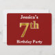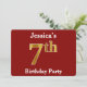 This invitation design features the ordinal number "7th" with a faux gold-like appearance. It also features a personalised name, and a red background. The event details on the back can be personalised. It could be used to invite people to somebody’s seventh birthday party. [~Z0000012]
