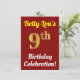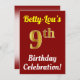 This birthday party invitation design features a message like "Betty-Lou’s 9th Birthday Celebration!", where the name can be personalised, and where the number "9th" has a faux gold-like appearance. It also features a red coloured background. The event details on the back can be customised. It could be used to invite people to somebody’s ninth birthday celebration or birthday party. [~Z0000120]