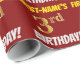 This wrapping paper design features a message like "FIRST-NAME’S 3rd BIRTHDAY!", with the "3rd" having a faux/imitation gold-like colour appearance, and with the name and "BIRTHDAY" in a fun, bold font. The name can be personalised, and the background is coloured red. Wrapping paper like this could perhaps be used when wrapping birthday gifts being given to somebody in celebration of their third birthday. [~Z0000204]