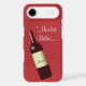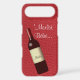 Faux red leather with a textured look. Photo generated close-up of tanned, embossed, and dyed red leather. Wine bottle tilting to the left, with french text, "'Merlot Bèbè" at top.