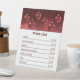 Festive price list design for Christmas markets and vendor booths featuring Destei's original illustration of red and golden yellow colour festive Christmas baubles that have a snowflake pattern on them. The background is a beautiful red bokeh.