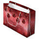 Destei's original illustration of red and golden yellow colour festive Christmas baubles that have a snowflake pattern on them. The background is a lovely red bokeh. There are also two personalizable text areas.