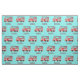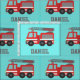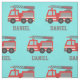 A fabric with a red fire truck that has white stripes on its side and a retractable ladder with hose. Use this fabric to make curtains or pillow covers and many more for a kids room, especially if he likes fire engines. Personalise easily with child's name.