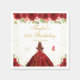 This elegant and glamourous birthday party napkin features a beautiful princess with brown red hair and fair skin in a red ball gown. The text combines handwritten script and modern sans serif fonts for a classy and sophisticated look. The floral arrangements, butterflies and gold confetti create the perfect blend of rustic and chic.