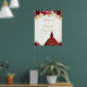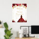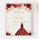 This elegant and glamourous Quinceañera birthday party welcome sign features a beautiful princess with dark hair in a tiara and red ball gown. The text combines handwritten script and modern sans serif fonts for a classy and sophisticated look. The floral arrangements, butterflies and gold confetti create the perfect blend of rustic and chic.