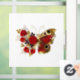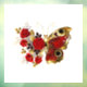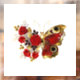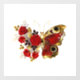 Red peacock eyed flower butterfly with red textured wing, decorated with composition of red, artistically painted roses with golden stems and leaves on white background.