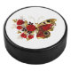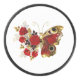 Red peacock eyed flower butterfly with red textured wing, decorated with composition of red, artistically painted roses with golden stems and leaves on white background.