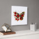 Red peacock eyed flower butterfly with red textured wing, decorated with composition of red, artistically painted roses with golden stems and leaves on white background.