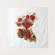 Red peacock eyed flower butterfly with red textured wing, decorated with composition of red, artistically painted roses with golden stems and leaves on white background.