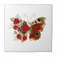 Red peacock eyed flower butterfly with red textured wing, decorated with composition of red, artistically painted roses with golden stems and leaves on white background.