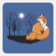 A red fox sits beside pumpkins and autumn leaves. Some Autumn leaves are flying towards the forest in behind the fox