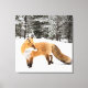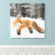 Red fox with bushy tail in cold white snow. Tall green pine tree forest in the background. Beautiful nature.