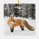 Red fox with bushy tail in cold white snow. Tall green pine tree forest in the background. Beautiful nature.