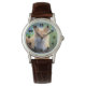 A watch with a colourful wildlife image of a red fox laying down in green grasses. This cute creature has soft fur and gentle eyes. Image has a dreamy magical feel.