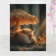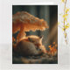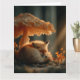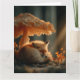 A magical and heartwarming image of a tiny red fox curled up and peacefully sleeping beneath a massive, textured mushroom cap. The scene is set in a dark forest, beautifully illuminated by golden rays of sunlight (a sunbeam effect), which highlights the fox's fur and the warm tones of the mushroom and autumn leaves.
