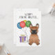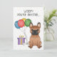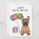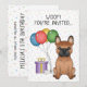 Cute birthday theme design featuring Destei's original cartoon illustration of a cute red with black mask colour French Bulldog / Frenchie breed dog. Next to the dog there are colourful birthday balloons tied on a dog bone and a purple and yellow colour present box. The background has a playful pattern of colourful pastel confetti on a white background. Personalise the sample text areas with the details of your event.