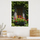 The pretty Red Geranium Window Box Print makes a thoughtful floral gift idea for a flower lover, gardener or florist. This beautiful custom flowery print features a scenic nature photograph of a window box filled with red geranium flower blossoms with green vines, leaves and foliage.